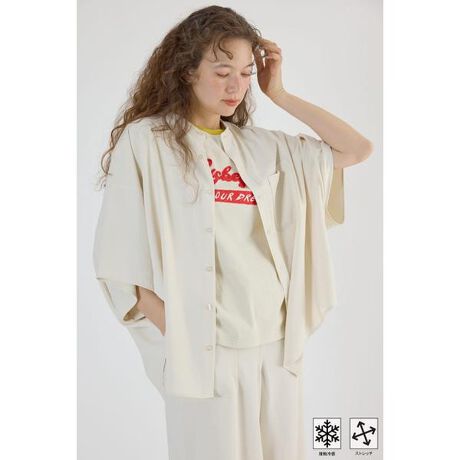 ■ポイント接触冷感、ストレッチの機能付きでこれからの季節にピッタリなドルマンシャツ。■ディティールシワにもなりにくくお手入れ楽ちんなのもうれしいポイント。ゆとりのあるサイズ感ですが、程よい落ち感ですっきり見えします。ドルマンシルエットでストレスフリーのトップスです。スッキリとしたバンドカラーです。■スタイリングTシャツやキャミソールの上からラフに羽織るだけで、シンプルながらに存在感抜群のアイテムです。同素材のクールカルゼルーズジョグパンツ(420ISR31-2201)とセットアップでもおすすめです。■生地伸縮性があり、ひんやりとした肌触りのポルエステルツイルを使用しています。きれいめになりすぎないシボ感がある生地です。■透け感:なし■光沢感:なし■伸縮性:あり■裏 地:なし[注意事項]※画像の商品はサンプルです。実際の商品と仕様、加工が若干異なる場合があります。※画像の商品は光の照射や角度、お使いのモニター環境により、実物と色味が異なる場合がございます。※着用、お取り扱いの際は、アテンションタグをご確認ください。