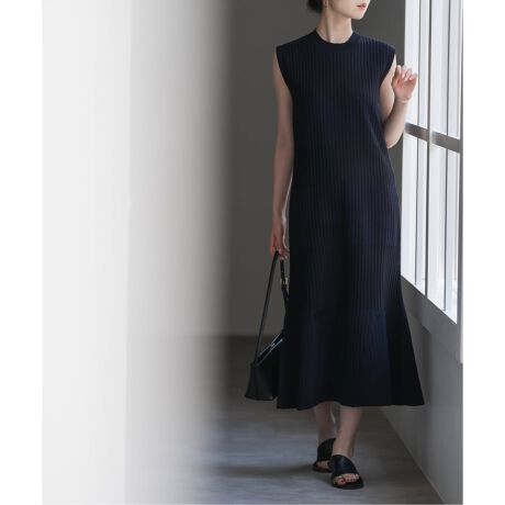 スリーブレスと程良く詰まったクルーネックで上半身はミニマムに、裾にかけて広がるシルエットがフェミニンな印象の1枚。