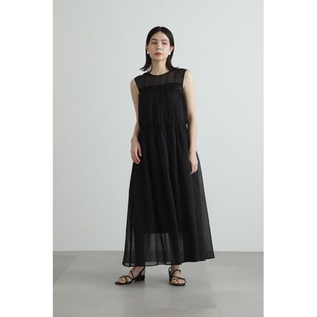 ポリエステルのドライオーガンジーで仕立てた大人ワンピースハリコシ加工を加えた、麻のようなタッチが特徴の素材です。バスト上とウエストラインには、同色のコットングログランをポイントで使用。ウエストを絞りすぎないシルエットなので、程よくリラックスした着こなしに。透け感のある素材ですが、インナーキャミソールをセットしているので、1枚で安心して着用いただけます。インナーキャミソールの上端は、ワンピースのバスト上の切替に合うよう設定しているため、透け感のある素材をいかしながらキレイなバランスを演出してくれます。