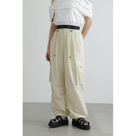 デイリーはもちろん、海や公園などのレジャーシーンや雨の日にもストレスなくはけるナイロンカーゴパンツ軽くやや透け感のある撥水加工されたナイロン素材を使用しているため、取り外しできるインナーパンツを付けています。インナーパンツのウエストラインには、見せポイントになるJILL STUARTのロゴ入りゴムを使用。ウエストと裾にはドローストリングを通しているので、お好みのサイズに調整が出来ます。