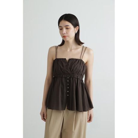 大人のサマースタイルを叶えるキャミソールブラウスコーマ糸を使用した毛羽立ちの少ないきれいな表面感に、ナチュラルワッシャー加工をした、ソフトな手触りのコットンローン素材を使用。貝釦は開閉でき、後ろ身頃とアンダーバストにはゴムを通しているので、着心地よく着用いただけます。脇はファスナー付き、肩紐の長さ調節は後ろ身頃の内側で可能。タックディテールワイドパンツ(商品番号0924230001)や、デニムパンツと合わせてカジュアルに着こなすのもお勧めです。