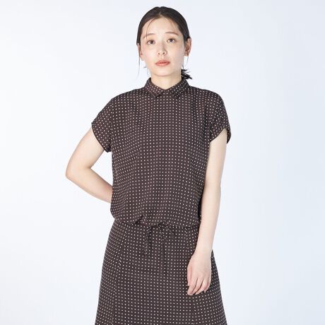 スクエア型のドットが規則正しく並ぶファブリックを用いたブラウス。裾をドローコードで絞れる設計で、トレンド感をプラスしています。背面をジップ仕立てにした襟付きのデザインで、きちんとした印象のスタイリングを実現。同素材のスカートを合わせたセットアップスタイルもお楽しみいただけます。