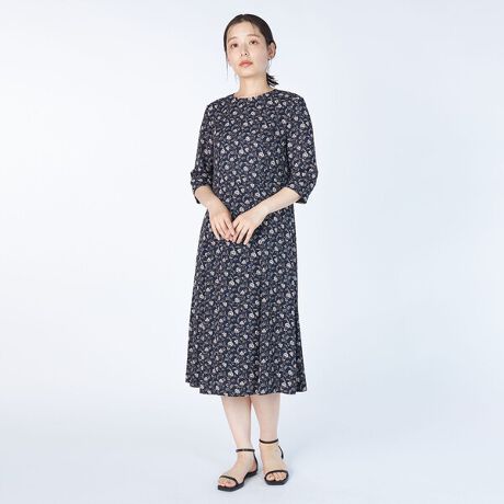 さらりとした風合いの素材を用いたワンピース。心が安らぐようなボタニカルプリントを用いて、ロマンティックな表情に仕上げています。身体を締め付けないリラックス感のあるシルエットでも、ドレープが縦のラインを強調してすっきりと着られるのが特徴。ジャケットなどを合わせれば、改まったシーンにも活躍します。アンダースカート付き。