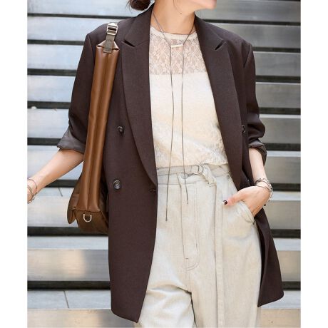 ダブル仕様でピークドラペルのマスキュリンなデザイン、素材の柔らかさと絶妙なサイズ感で、かっこよくも女性らしくも着こなせます。