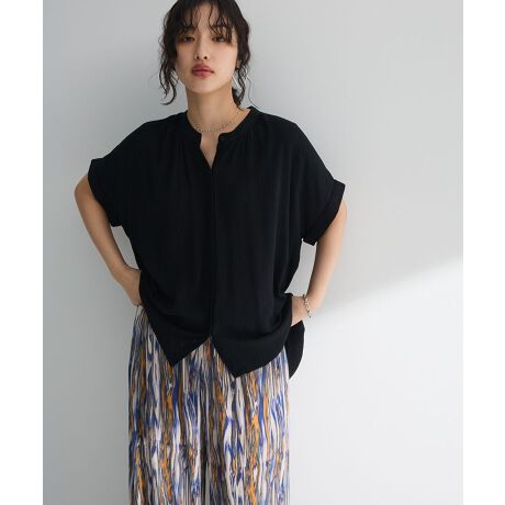 #レーヨンクレープ #バンドカラー #ドルマンスリーブ #バックギャザー#前後差 #体型カバー #きれいめ #オフィスカジュアル #夏#とろみ #シアー#半袖 #上品ブラウス #ニュアンスカラー