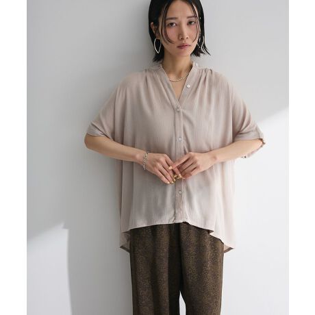 #レーヨンクレープ #バンドカラー #ドルマンスリーブ #バックギャザー#前後差 #体型カバー #きれいめ #オフィスカジュアル #夏#とろみ #シアー#半袖 #上品ブラウス #ニュアンスカラー