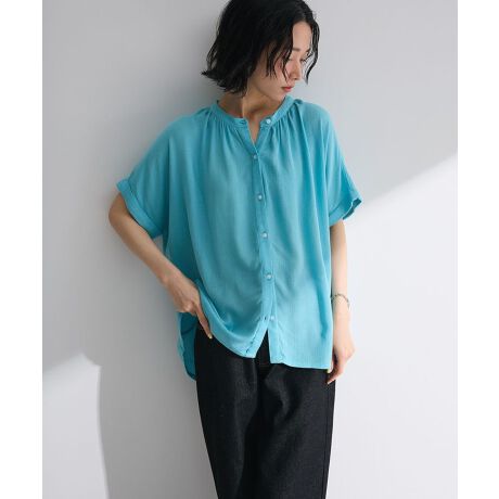 #レーヨンクレープ #バンドカラー #ドルマンスリーブ #バックギャザー#前後差 #体型カバー #きれいめ #オフィスカジュアル #夏#とろみ #シアー#半袖 #上品ブラウス #ニュアンスカラー