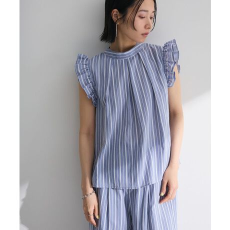 サマースタイルに最適なコットン素材のデザインブラウス。ノースリーブにフリルをたっぷり加えたフェミニンなアクセントが魅力です。甘さがありながら爽やかなストライプ柄で上品な雰囲気なのもポイント。フロントタックから自然に広がる程よいAラインが着映えを叶えてくれるおすすめのアイテムです。透け感[ややあり]