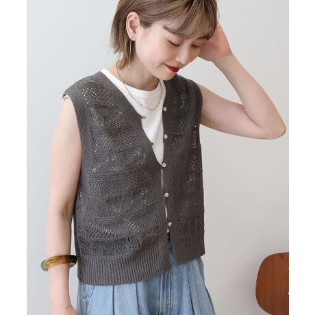 おしゃれなレースの編み地が夏のシーズンムードを盛り上げるニットベスト。レイヤードの透け感を楽しめるトレンドを押さえた1着です。シルエットはコンパクトながらも、アームホールを広めにデザイン。夏はチューブトップやキャミソールを合わせた涼やかなスタイルに、TシャツやロングTシャツとも相性良くロングシーズン着用いただけます。前後2WAY仕様で着回し力も抜群。透け感[あり]