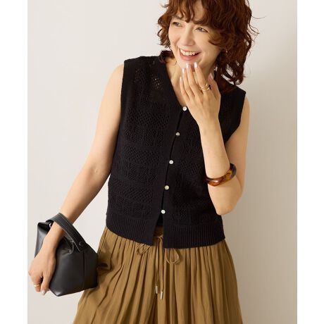 おしゃれなレースの編み地が夏のシーズンムードを盛り上げるニットベスト。レイヤードの透け感を楽しめるトレンドを押さえた1着です。シルエットはコンパクトながらも、アームホールを広めにデザイン。夏はチューブトップやキャミソールを合わせた涼やかなスタイルに、TシャツやロングTシャツとも相性良くロングシーズン着用いただけます。前後2WAY仕様で着回し力も抜群。透け感[あり]