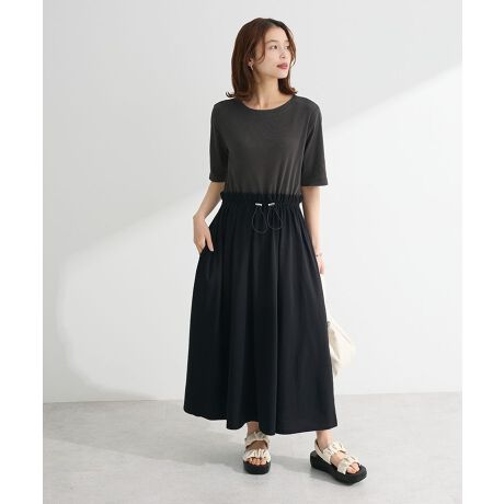 クリーンな印象のリブに異素材をドッキングしたワンピース。ソフトフィットな五分袖がアームラインをすっきりと華奢に見せてくれます。ウエストドロストでシルエットのアレンジが出来るのも嬉しいポイント。配色コントラストが着映えを演出し、一枚さらっと着るだけでサマ見えを叶えてくれるおすすめのアイテムです。清涼感のあるクール素材を使用。透け感[なし]