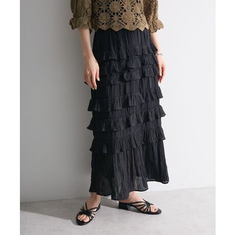 シワ加工を施したライトなテキスタイルが爽やかな印象のロング丈スカート。裾に向かって広さを変えたフリルアクセントがフェミニンなデザインです。ウエストゴム仕様でフィット感も良く、旬のトップスインスタイルもマッチ。バックスリット入りで足捌きもしやすく、エアリーにアクセントををプラスしてくれるおすすめのアイテムです。透け感[ややあり]
