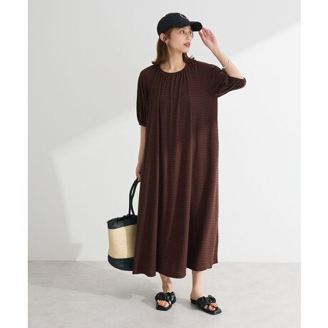 縦長のリブにボーダー柄がカジュアルに着映えを叶えるロングワンピース。襟周りのギャザーとラグランラインで切り替えたバルーンスリーブが女性らしいデザインです。バックネックの大胆なカットとリボンがヘルシーな肌見せを演出。肌触りのソフトな素材で快適な着用感も魅力のおすすめアイテムです。透け感[ややあり]