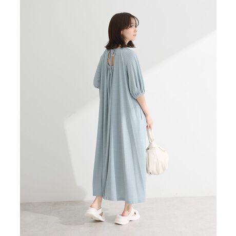 縦長のリブにボーダー柄がカジュアルに着映えを叶えるロングワンピース。襟周りのギャザーとラグランラインで切り替えたバルーンスリーブが女性らしいデザインです。バックネックの大胆なカットとリボンがヘルシーな肌見せを演出。肌触りのソフトな素材で快適な着用感も魅力のおすすめアイテムです。透け感[ややあり]