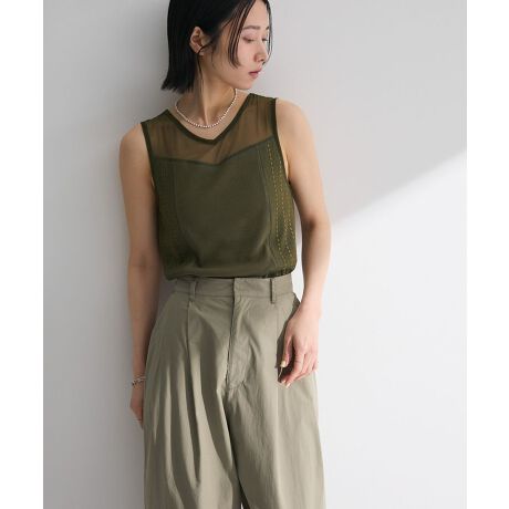 ストレッチの効いたリブにシアーとレースで華やかさを加えたタンクトップ。 スクエアネックとVネック、前後2WAYの着こなしがお楽しみいただけます。そのままさらっと一枚で着られる便利なカップ付きデザイン。一枚着るだけでヘルシー&フェミニンな肌見せスタイルが叶うおすすめのトップスです。透け感[ややあり]