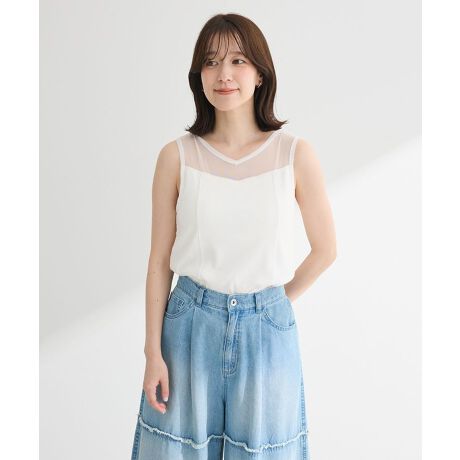 ストレッチの効いたリブにシアーとレースで華やかさを加えたタンクトップ。 スクエアネックとVネック、前後2WAYの着こなしがお楽しみいただけます。そのままさらっと一枚で着られる便利なカップ付きデザイン。一枚着るだけでヘルシー&フェミニンな肌見せスタイルが叶うおすすめのトップスです。透け感[ややあり]