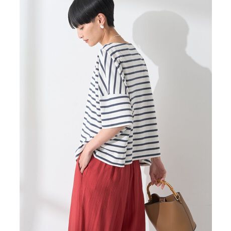 爽やかな配色ボーダー柄が着映えを叶えるバスクプルオーバー。ゆったりと落ち感のあるオーバーシルエットがこなれ感たっぷりのひと品です。しっかりした生地感で型崩れがしにくいのも嬉しいポイント。ベーシックなデザインで幅広いアイテムと着合わせしていただけるおすすめのアイテムです。透け感[ややあり]
