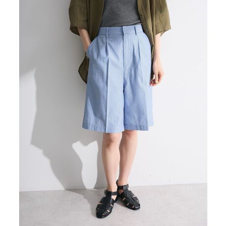 コットン混のさっぱりとしたテキスタイルで仕立たショート丈パンツ。凹凸のあるサッカーストライプ柄が爽やかな印象をプラスしてくれるクールなデザインです。フロントワンタックのシンプルなデザインでどんなトップスとも好相性。バックウエストゴム仕様で楽に着脱出来、ベルトループ付きでアレンジも楽しめます。透け感[なし]