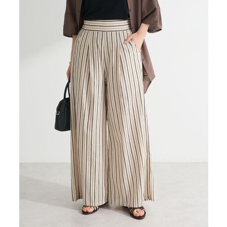 バイカラーのステッチストライプが爽やかな印象のワイドパンツ。すとんと落ちるきれいなシルエットがエレガントな着こなしを演出します。バックゴム仕様にくわえ、フロントタックを施す事で腰回りにゆとりをもたせたラフな穿き心地も魅力的なポイント。1枚オンするだけでウィットに富んだハンサムスタイルが決まるおすすめのアイテムです。透け感[ややあり]