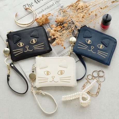 フェイクレザー素材のネコ刺繍パスケース。