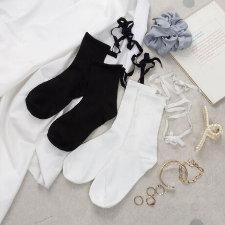 柔らかな細リブ編みで、ソフトな履き心地のレースアップミドル丈ソックス。