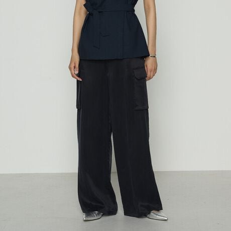 シルクの様なつや感のある生地でつくるワイドシルエットカーゴパンツです。