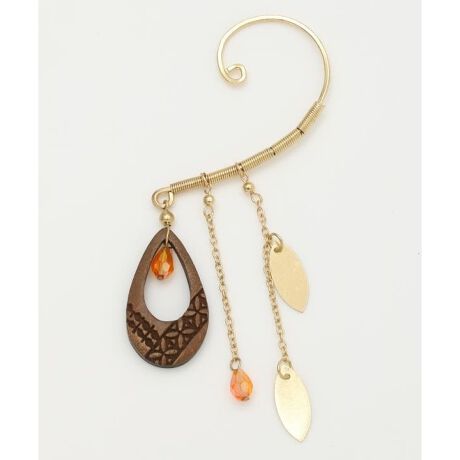 [型番:IJCZ2204-2024]ひと味違うあなたに。大ぶりのウッドチャームが耳元で揺れるイヤーフック。ピアスホールが不要で気軽に耳元を彩ることができる。ウッドパーツには力強さを感じるタパ柄が彫られ、さりげない主張に。
