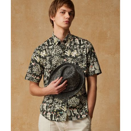 リバティタナローンプリント半袖シャツは、リバティ社が独自に開発したローン素材を採用しています。リバティが誇るタナローンは、上質なシルクの艶や手触りを木綿で再現した生地です。やわらかな肌ざわりと軽さ、さらに豊かなドレープ性を持っているため、快適に着用できる一枚です。