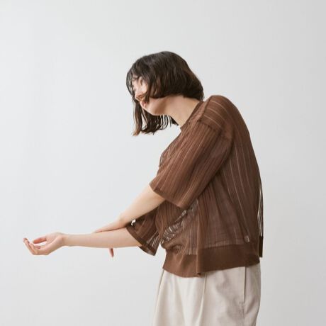 清涼感のあるドライタッチな素材を使用。透かし編みでストライプ調の編み柄を表現した、シアーニットです。見た目の清涼感だけでなく、肌離れの良いさらりとしなやかな着心地が特徴です。
