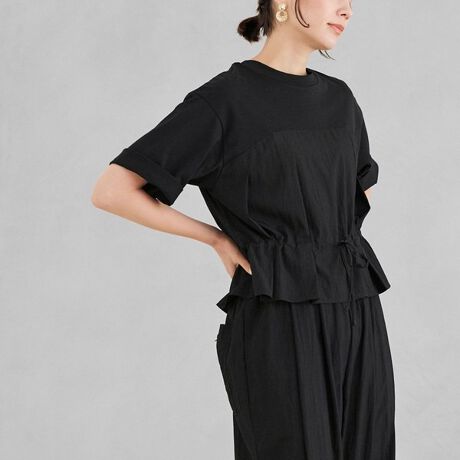 一見複雑に見えるデザインですが、実は一枚で着られる便利さが魅力です。ウエストのドローストリングを調整すれば、メリハリのあるシルエットが作れるので体型カバーにも◎。フロントのリボンも可愛すぎず大人っぽい雰囲気です。デニムやカジュアルパンツはもちろん、タイトスカートと合わせるとオフィスカジュアルにも使えて、着回し力抜群。忙しい朝でも一枚でサマになるので、ヘビロテ間違いなしのアイテムです。