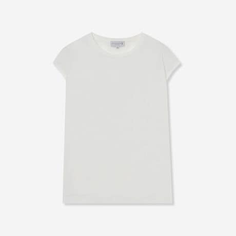 ヘルシーな印象のノースリーブプルオーバーです。裾、袖口は折り上げ接着する仕様で、肩傾斜・衿元・アームホールは身体に添わせながら着心地を考慮した仕立てになっています。
