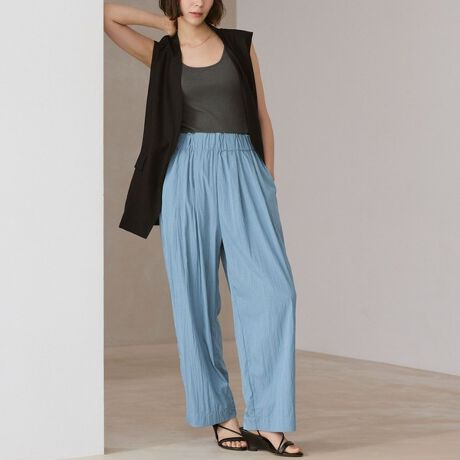 分量感のあるワイドシルエットがトレンドに左右されず長く愛用できるパンツです。締め付けの少ないウエストに加え、全体に細かく施したタックとギャザー使いにこだわり、ヒップや腰回りのラインを拾いにくい絶妙なシルエットに。履き心地の良さと品のあるスタイルが両立するイージーパンツは、ジャケットと合わせればビジネスシーンに、Tシャツやタンクトップなどラフなアイテムと合わせればデイリー使いも叶う万能アイテムです。サイドとバック部分にはポケット付きで機能性も◎。