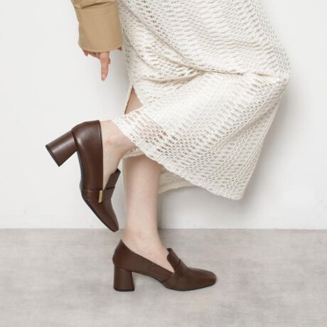 アッパーのベルトにワンポイントのゴールドの金具が付いており、スクエアトゥが落ち着いた印象を与えるデザインローファー。