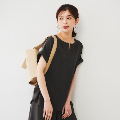 衿元のキーネックは、上品な開きになっており、インナーを選びません。