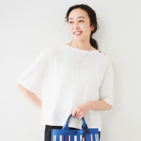 ボートネックで着丈が少し短めでパンツにもスカートにも合わせられる、清涼感&ほんのりシアーなニットです。