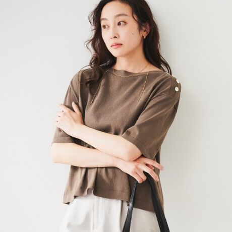 ボートネックで着丈が少し短めでパンツにもスカートにも合わせられる、清涼感&ほんのりシアーなニットです。