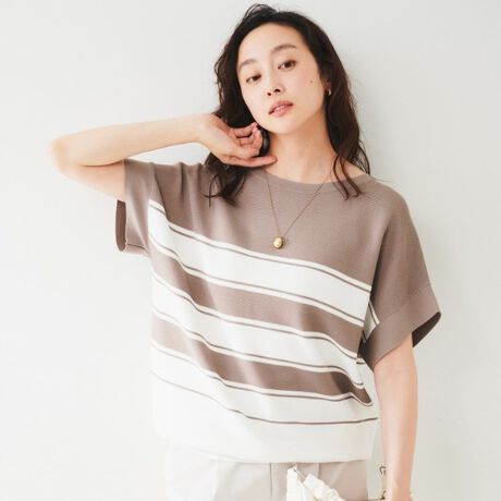 薄手ながら透けにくい肉感、さらっとした清涼感のあるキレイめな素材感のストレッチ素材のフレンチスリーブニット。