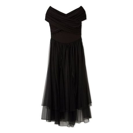 <b>【カットソー素材とチュール素材のコンビで完成。エレガントなオフショルワンピース】</b>