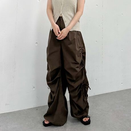 サイドの大胆なドロストがポイントのカーゴパンツ。