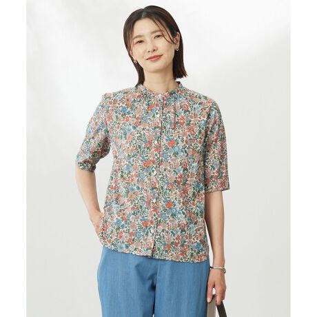 繊細なリバティ柄とギャザーが華やかな、バンドカラーブラウス