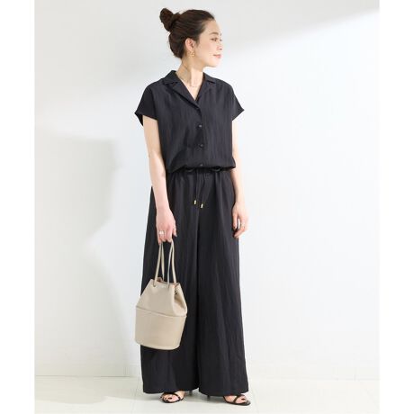 シボ感のある薄手の化合繊素材を使用しているのでシワが気になりにくく、軽い着心地が魅力。リボン先端の金具がポイントになったウエストリボンを絞れば、ウエスト位置高めですらっと縦長ラインが強調されます。