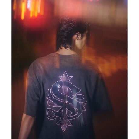 フロントにはブランドロゴ刺繍とピアス、バックには圧倒的な存在感を放つラインストーンとプリントで表現したグラフィックを大胆にオン。