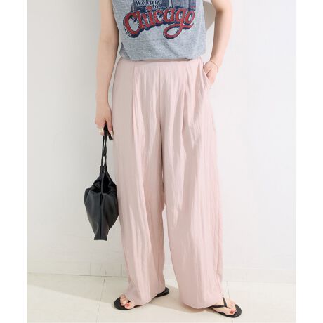 淡いニュアンスカラーがポイントになるイージーパンツ。
