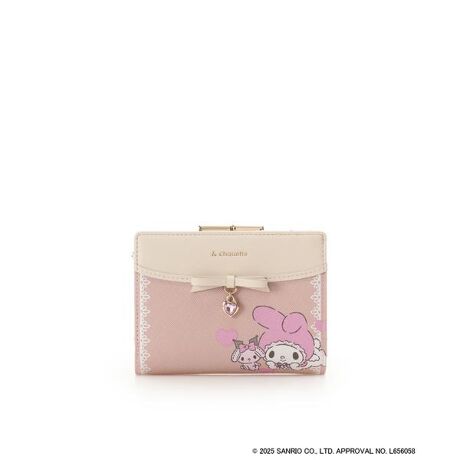 ◇& chouette(アンドシュエット)の「マイメロディ」&「クロミ」コレクション 折財布「マイメロディ」バッグのデザインとリンクした口金折財布が登場。フロントに大きくプリントされた、アニバーサリー限定アートと立体的なリボンモチーフにハートストーンがポイント。スナップボタンを開けると、「マイメロディ」と「クロミ」のアートがプリントされており中まで可愛い世界観を楽しめるデザイン。カードのポケットは8枚、フリーポケットが3つ、小銭の収納箇所は2層式と収納力も◎