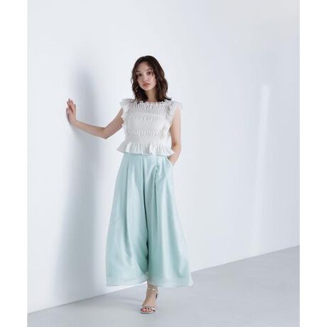 裾幅をふんだんに取ったフレアシルエットのワイドパンツ。動くたびにふわっと揺れ感のあるシルエットを演出します。フロントのタックは中縫いを入れることで、腰まわりをすっきりと見せながら程よくカバー。ウエストはベルト切り替えを入れつつ、後ろはゴム仕様のため、楽に着脱できるリラクシーなはき心地です。<素材>柔らかく程よい透け感のある合繊シアー素材を使用。透けにくい裏地が付いているので安心感のある着心地です。<詳細>仕様・開閉なし裏地・あり透け感・あり / 光沢・なし / 伸縮性・なし生地の厚さ・薄手※モデルの着用画像の場合、光の当たり具合により、実際の色味と異なって見えることがございます。色味は、商品単体の画像をご参照ください。