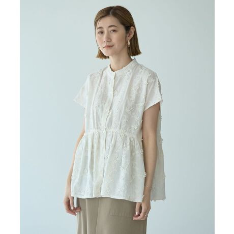 立体的なフラワー刺繍がスタイリングに映えるデザインブラウス。