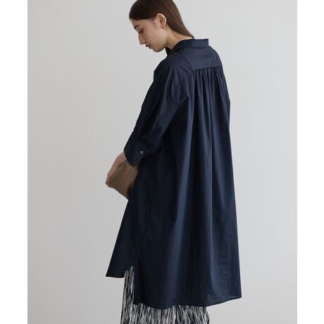 微光沢のあるペーパータッチ素材で仕立てたロング丈シャツ。