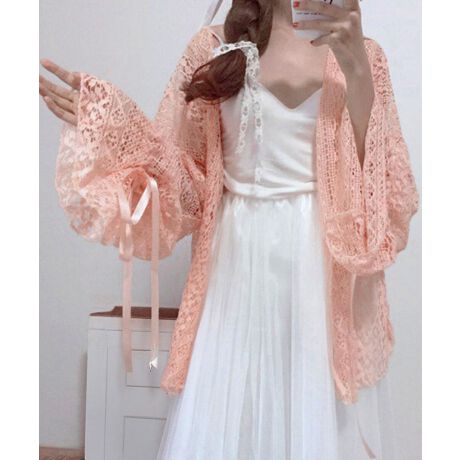 繊細なレース素材が目を引く、フェミニンな透かし編みカーディガン。