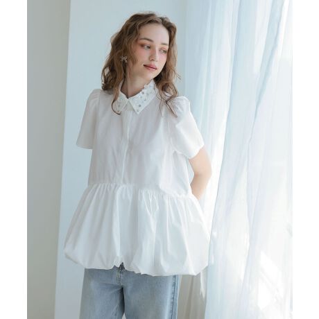 【Donoban】ハーフスリーブフラワービジューブラウス