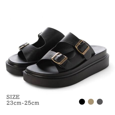 上質な素材を使用したダブルバックルサンダル。アンティーク調のゴールドバックルがアクセントになり、ナチュラルかつ高級感のある仕上がりです。フットベッドにはクッション性の高いブラックソールを採用し、長時間の歩行でも快適な履き心地を実現。ボリューム感のある厚底ソールはスタイルアップ効果も抜群で、カジュアルからモードまで幅広く対応します。